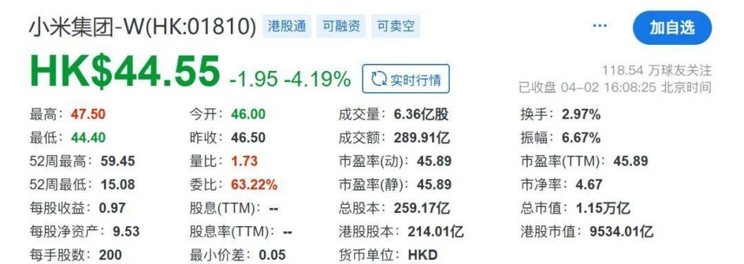 小米SU7安徽交通事故的余波,仍在连续冲击。4月2日,小米集团-W(01810.HK)开盘后股价呈现低开态势,早盘一度下降超4%,最低触及44.4港元/股,随后股价有所回升,但午后陆续下挫。放胆当日收盘,小米集团-W报收44.55港元/股,跌4.19%。