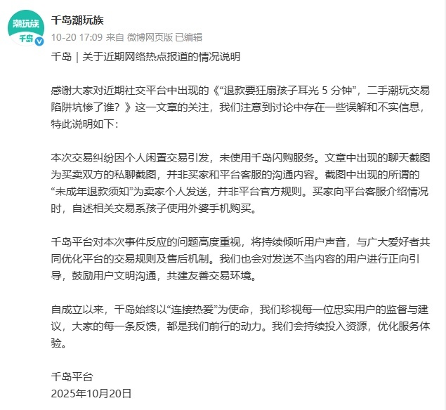 事件激发烧议后,千岛通过其官微回话暗示,此次交游纠纷因个东说念主闲置交游激发,未使用千岛闪购做事;网传聊天截图实为买卖两边的私聊截图,并非买家和平台客服的调换内容。这种格调,也显现了平台经管机制的间隙。