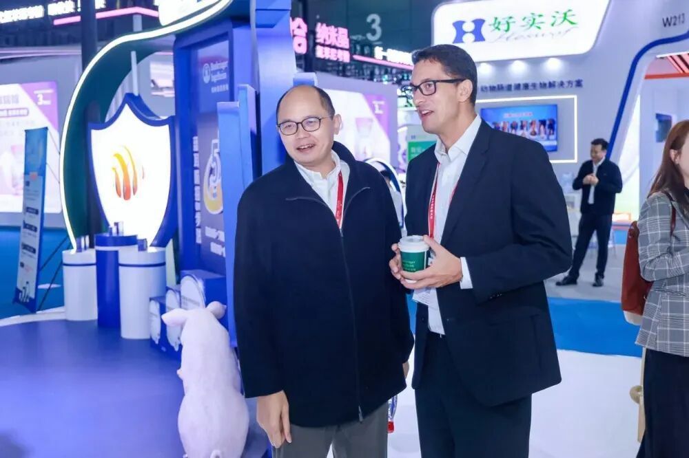 勃林格殷格翰中国猪业务认真东谈主聂卫星(左一)与大中华区动保业务认真东谈主安烁炜(左二)在展位相易